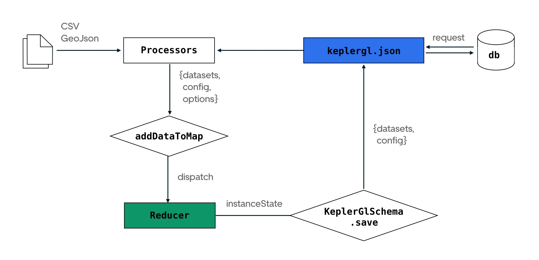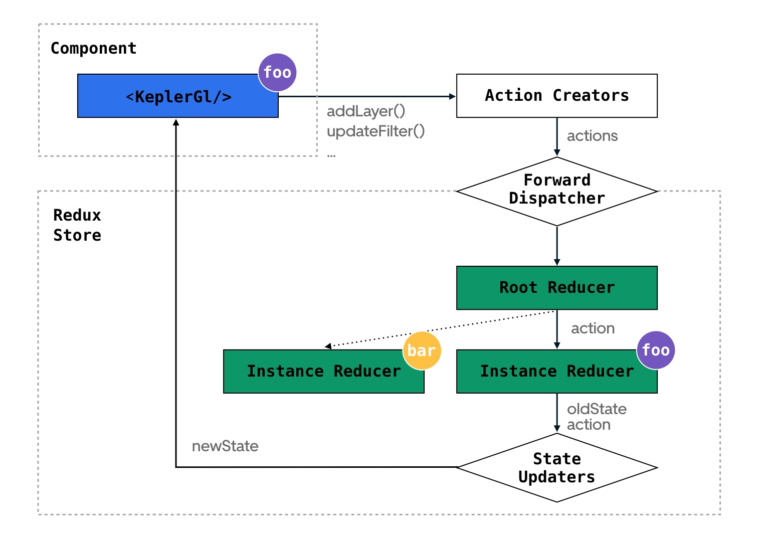 The diagram below represents the data flow. Note that in most cases, you don't have to worry about action creators, forward dispatcher and state updaters, as they are handled under-the-hood by kepler.gl