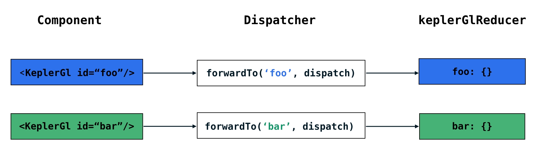 Each kepler.gl component receives a forward dispatcher as a prop, which dispatches a forwarded action to the root reducer. The root reducer will check if the given action has that address and if so, unwrap the action and pass it to the child reducer.