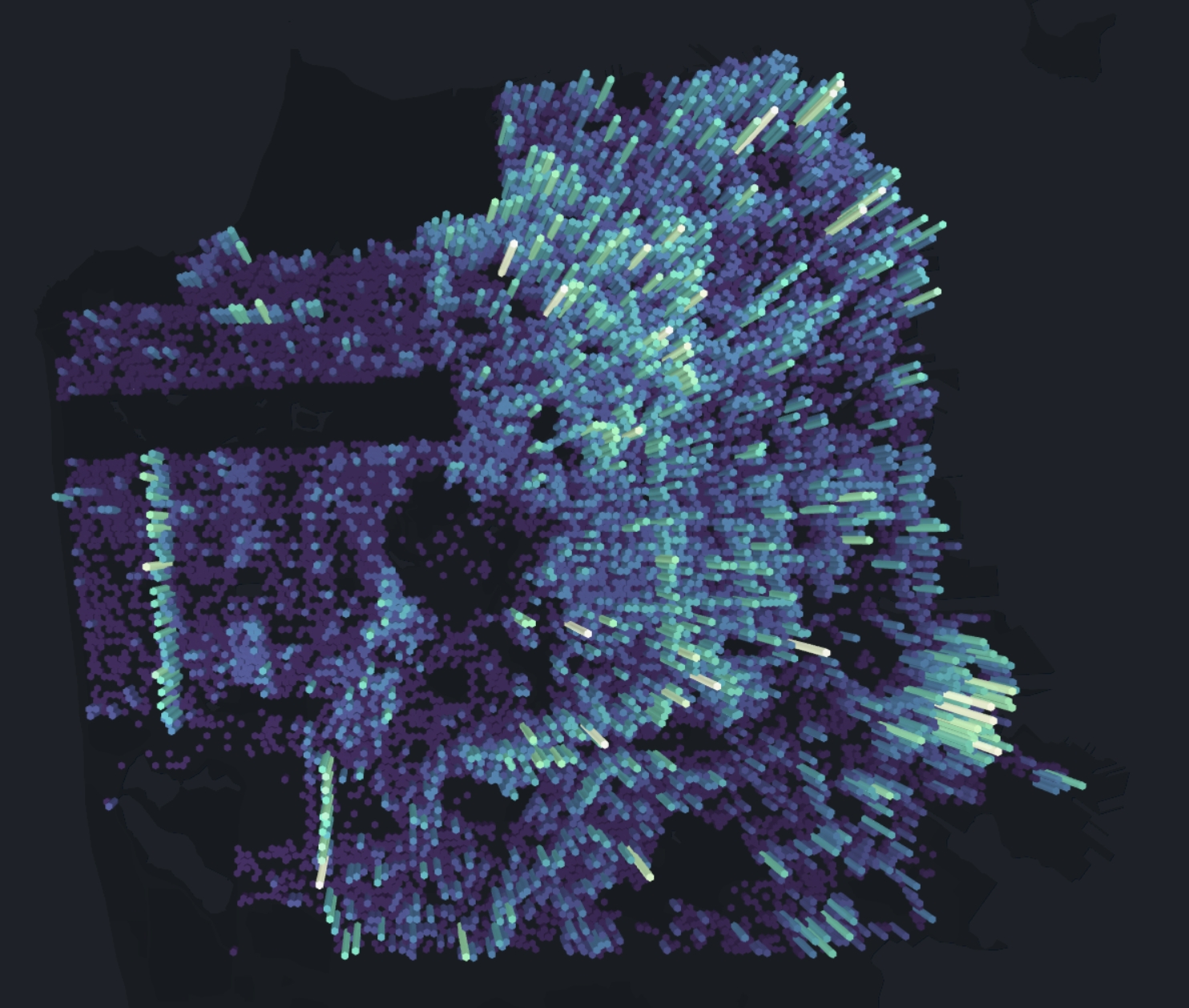 Hexbin layers are similar to grid layers. They display distributions of aggregate metrics such as point count within each hexbin, average/max/min/median/sum of a numerical field, or mode/unique count of a string field. Both the color and height dimensions can encode data. Users can adjust the hexagon radius and the space between hexbins.
