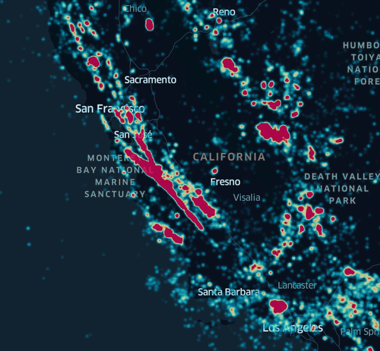 Heatmap layers describe the intensity of data at geographical points through a colored overlap. The intensity can be weighted by a numerical field.