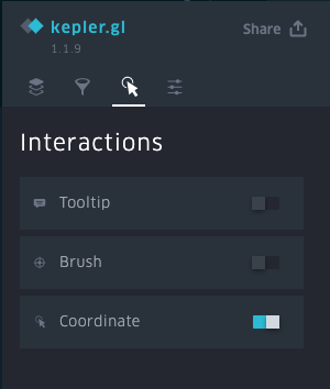 There are three types of interactions to choose from: Tooltip, Brushing and Coordinate. Note that only one of tooltip and brushing can be on at a time.