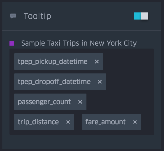tooltip displays metrics when hovering over a data point. You can choose which fields are displayed from the tooltip config menu.